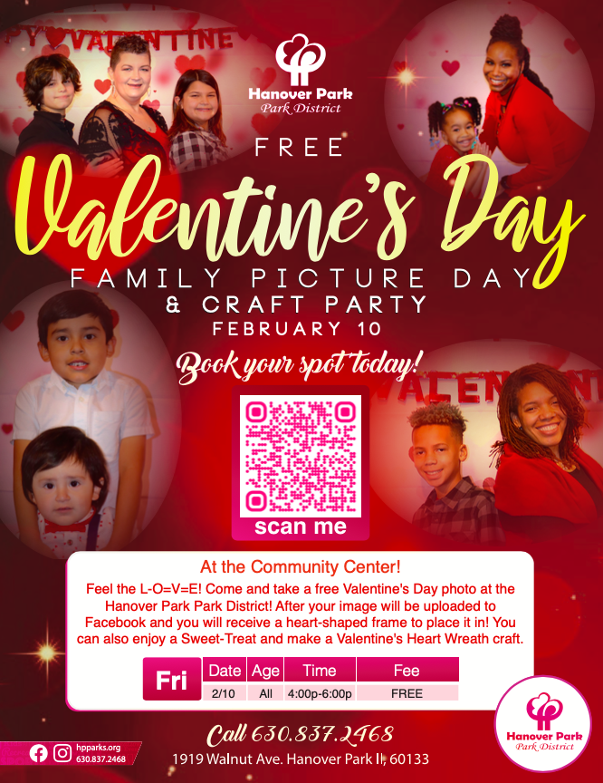 Hanover Park Park District is offering Free Valentine's Day Family Picture Day and Craft Party. February 10th from 4 pm-6 pm. This is a great free event to unite your family and see other community members. Click here to register.
